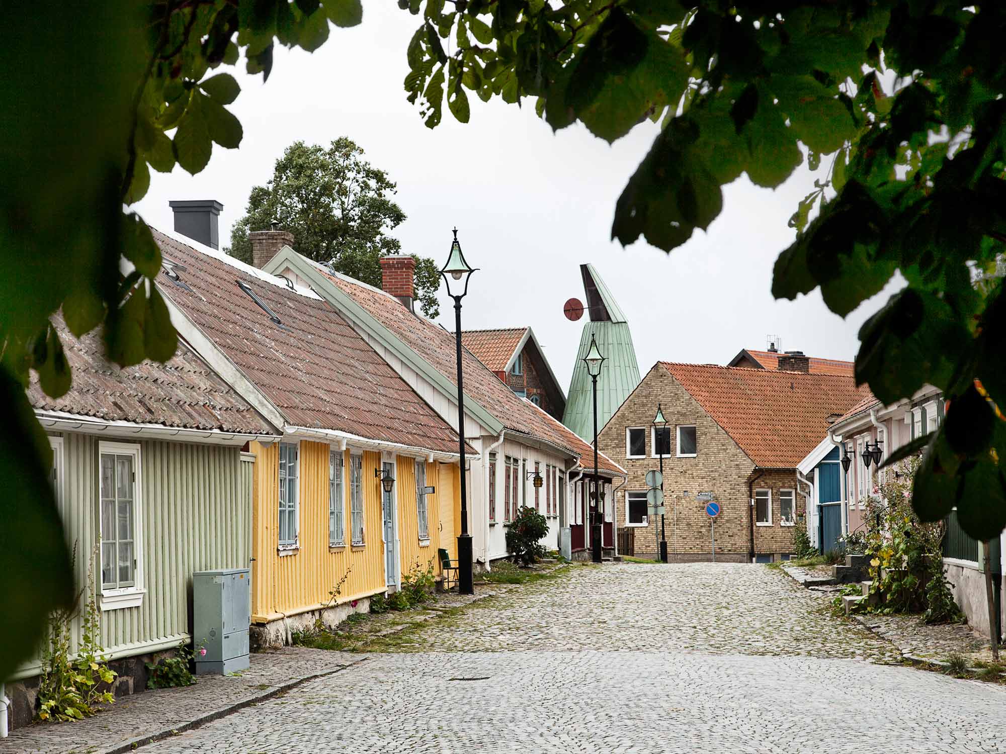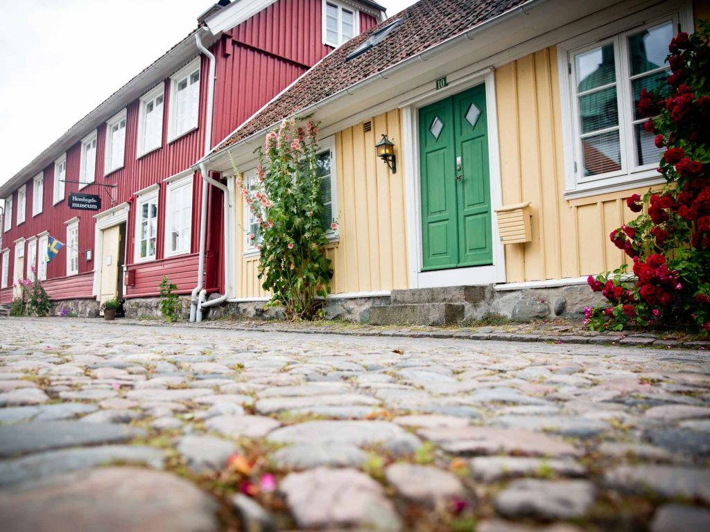 Underbara små hus på riktiga kullerstensgator.